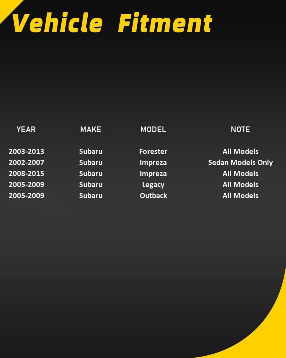 Compatible with Subaru Forester 2003-2013 All Models, Impreza 2002-2007 Sedan Models Only, Impreza 2008-2015 All Models, Legacy 2005-2009 All Models, Outback 2005-2009 All Models