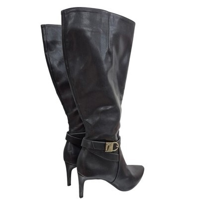 Calvin Klein Jemamine Black Vegan Leather Tall Heel Boots 9.5 Gold Buckle Design