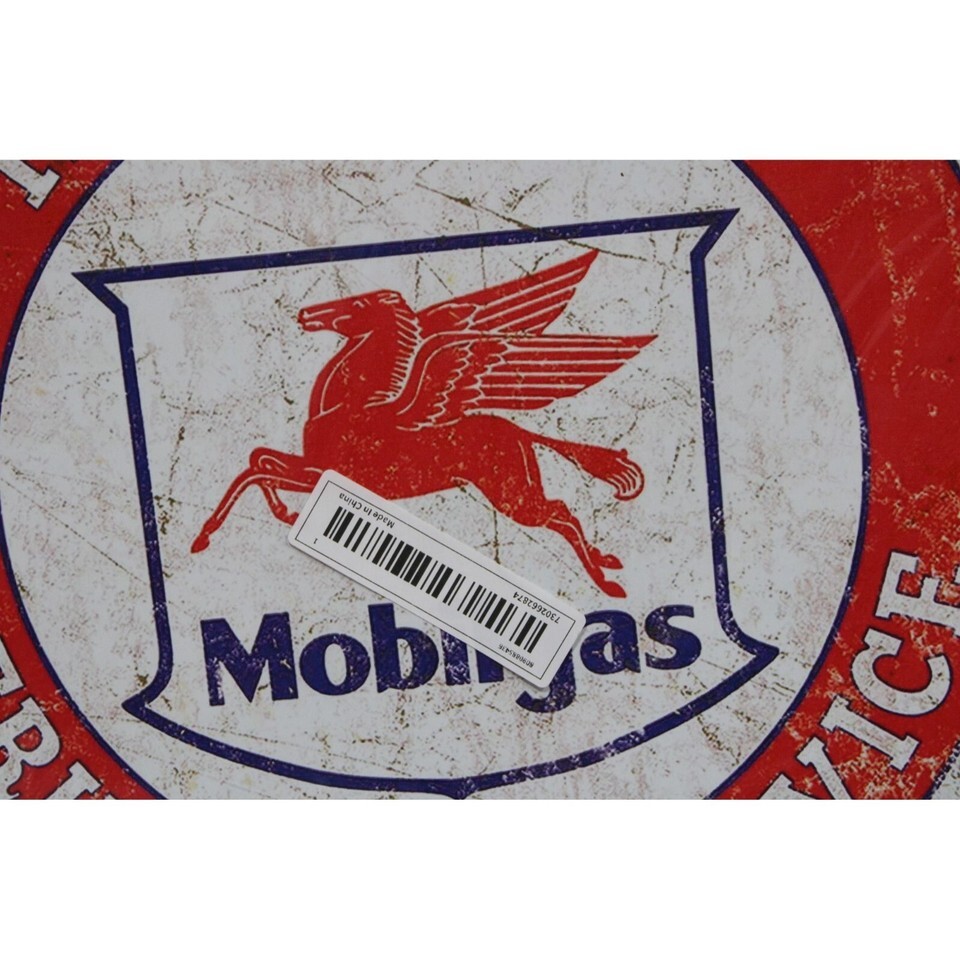Bring nostalgia to your space with this vintage Mobigas sign. It's a round tin sign featuring the iconic Pegasus and a friendly service message.