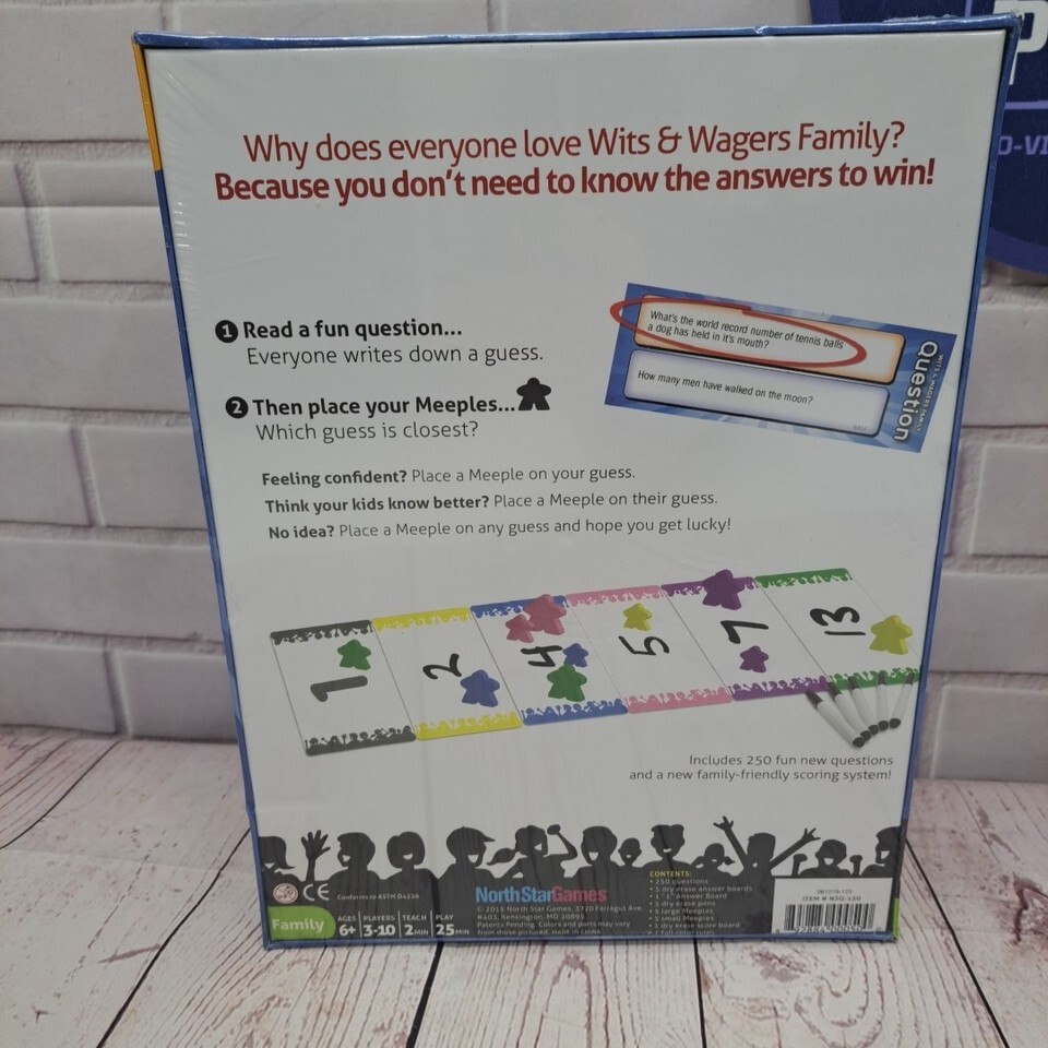 It is a "Wits Wagers" board game by North Star Games, suitable for ages 8 and up. This family party edition game from 2015 includes strategy, trivia, and betting elements, accommodating 3 or more players. It is made in China and comes sealed, making it ideal for board game nights and gatherings.