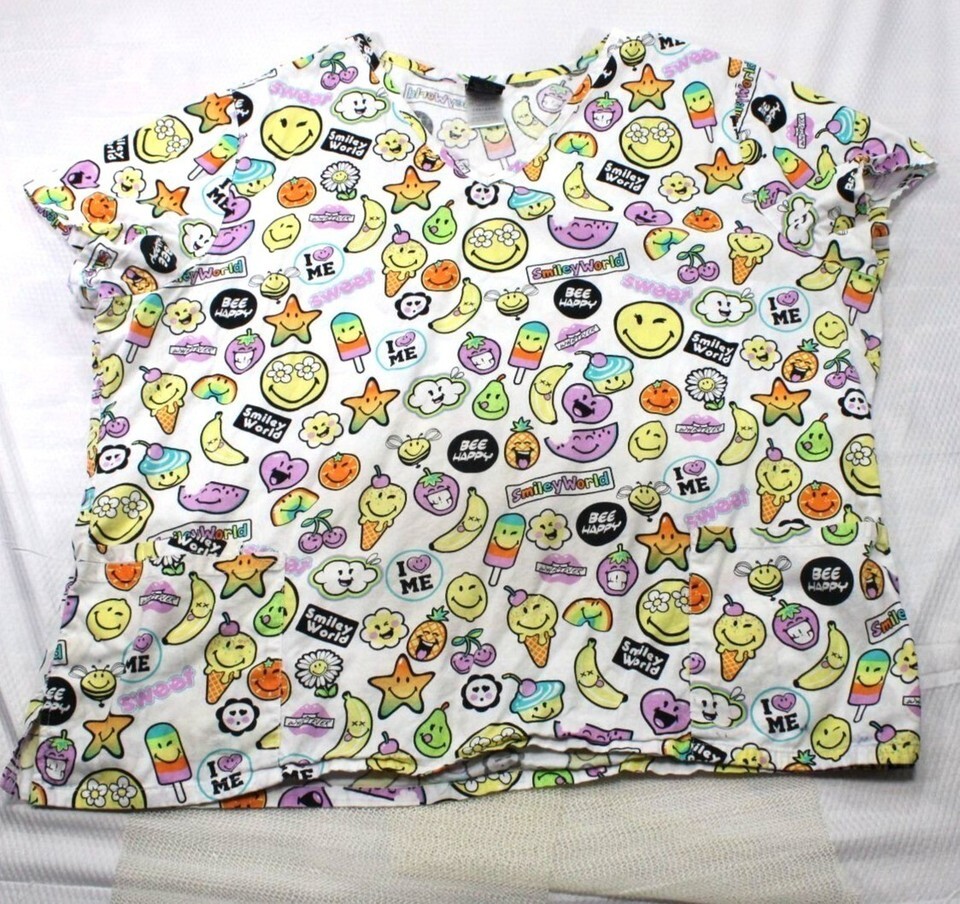 Smiley World Scrub Womens Top V Neck Pockets Short Sleeves 2XL Colorful
