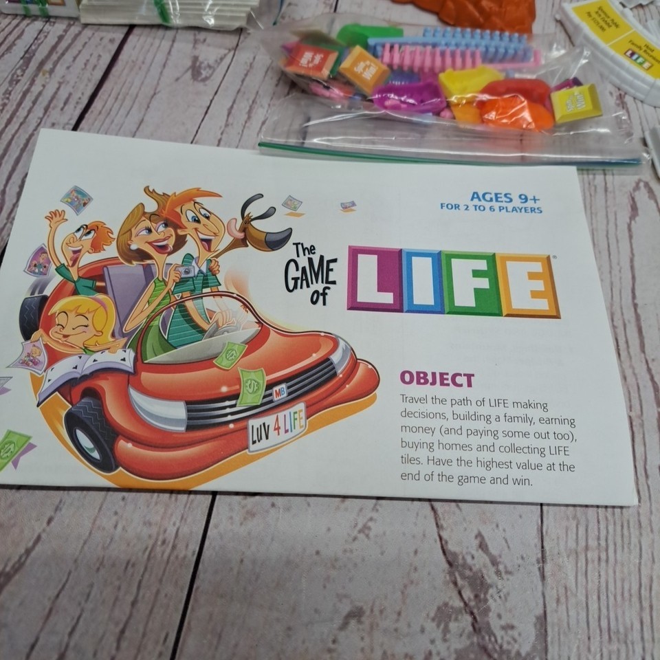 The Game of Life board game by Milton Bradley contains only replacement game pieces as shown. No box or board is included.