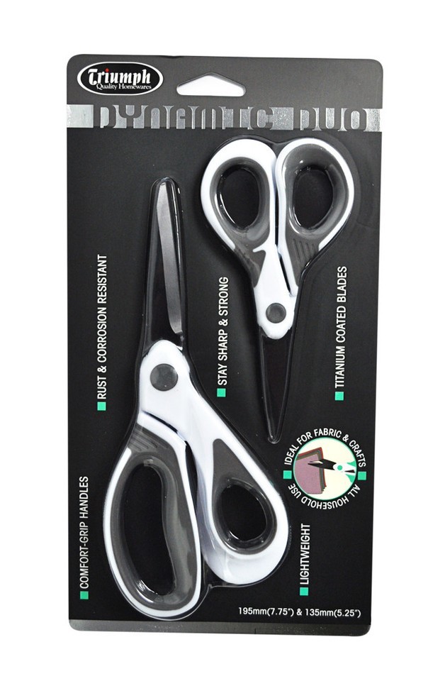 Two pack. One 7.75 inch and one 5.25 inch general purpose scissors. Titanium coated blades. Rust and corrosion resistant. Dishwasher Safe. Sharp tip for accurate cutting. Ergonomic soft-touch handles. Color: White and Gray.
