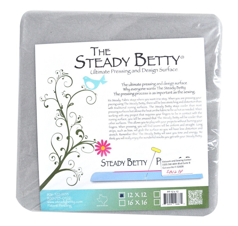 Ultimate pressing and design surface. Teachers, designers, and educators have discovered the wonderful benefits of using the Steady Betty. Other than the superior quality you have when pressing, there are some other uses, including applique using wool or cotton and paper piecing. Suggested additional uses of you Steady Betty are applique using wool or cotton, paper piecing , and beadings; as well as a wonderful tool for stabilizing the hoop for embroidery. Excellent as a lap platform when doing hand work; also an excellent surface for tracing. Use you steady Betty for blocking, quilt blocks, wool, crochet, and knitting. This is the perfect pressing surface, because the pressing process is as important as the sewing. When you are pressing your piecing with the Steady Betty there will be no stretching or distortion. Stays cooler than most pressing surfaces. Fabric color may change with time. Original Gray Designer Series Board. 12 inches x 12 inches.