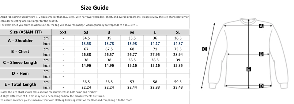 Asian Fit refers to clothing tailored for body shapes commonly found in Asian populations. These items typically run 1-2 sizes smaller than U.S. sizes, with narrower shoulders, chest, and overall proportions. Please check the size chart carefully or consider sizing up for the best fit.