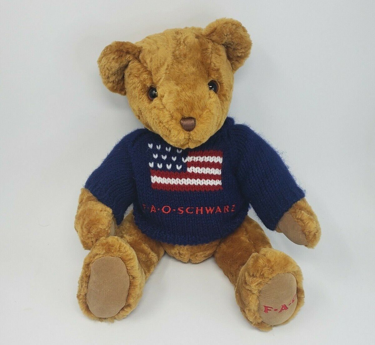 FAO SCHWARZ BROWN TEDDY BEAR W/ FLAG SWEATER JOINTED STUFFED ANIMAL PLUSH TOY