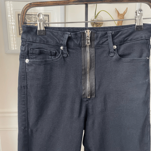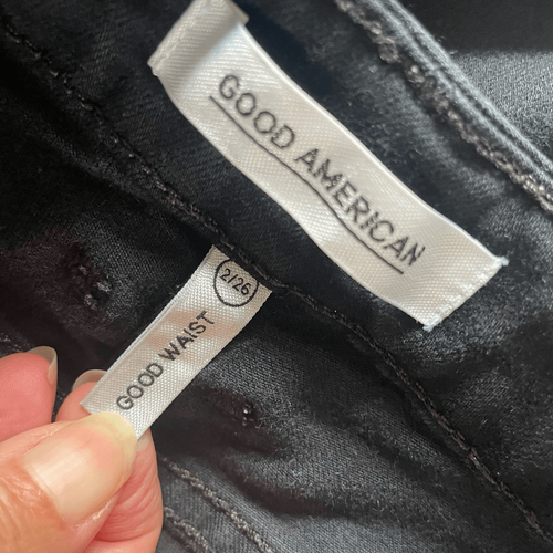 Good American exposed zipper skinny crop black jeans with raw hem. Cotton, rayon, T-400 and spandex blend. From Nordstrom. Made in the USA. 12.5 inches straight across the waist with a 10.5 inch rise and 24.5 inches inseam. There is a slight pucker on one side in the crotch area, but it is not visible when being worn. I didn?t even notice it until the jeans were hanging up.
