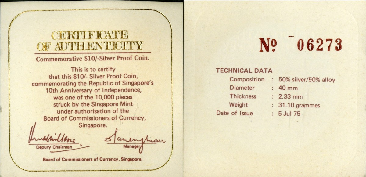 This is a 1975 10 dollar Singapore 10th anniversaty coin. Minted at the singapore mint, it comes with a COA and is number 6273 of 10,000 minted. I bought it in Singapore in 1976 when the USS Ranger visited during the Bisentennial.