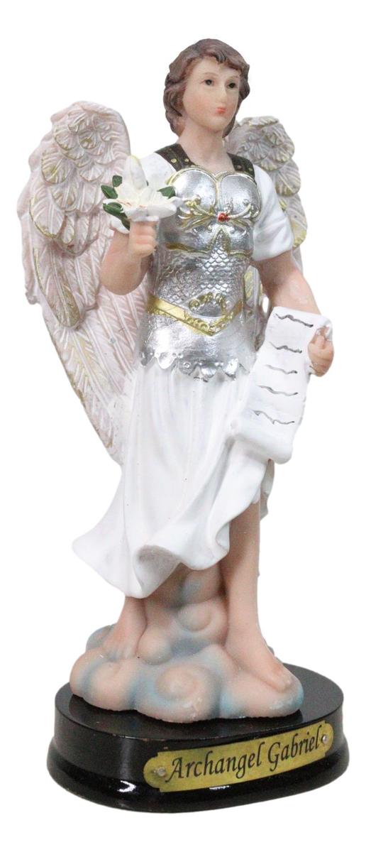 ? Own this marvelous figurine of the archangel Gabriel, the patron saint of Baptism and God's Messenger. Sculpted and handpainted on resin medium, this figurine stands on a black base with brass name plate. Gabriel holds a Scroll containing the Revelation Of Gabriel and a white lotus symbolizing purity, holiness, and the Virgin Mary.