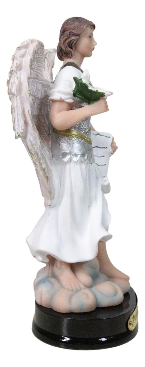? This Archangel Gabriel Holding Scroll And Lotus Figurine measures 5.5" tall, 2.25" wide and 2.25" deep approximately. The sculpture weighs about 6 ounces.