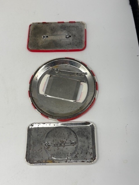 The largest is the 3 inch in diameter nametag, the one with the British flag was when we partnered with Great Britian, and the BADD one stands for "Bartenders Against Drunk Driving".