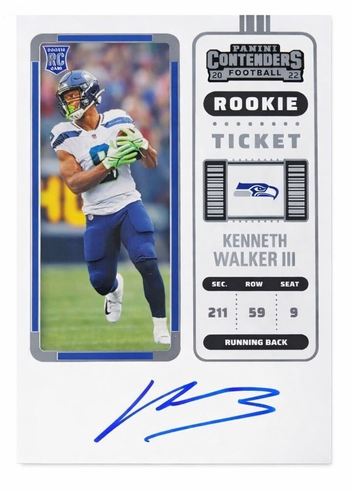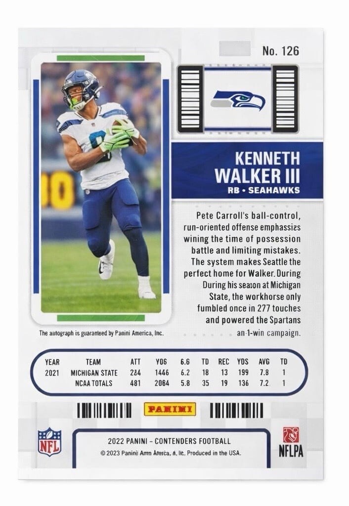Stunning Kenneth Walker III rookie autograph from the 2022 Panini Contenders Rookie Ticket set, featuring the Seattle Seahawks, Super Bowl XLVIII Champions and one of the NFL?s most respected franchises. This officially licensed NFL card showcases bold on-card ink and classic Contenders design, making it a strong addition for Seahawks fans, Super Bowl champion collectors, and NFL rookie auto investors. Clean, well-presented card ideal for display or long-term collection. Every order ships safely securely from Joshua?s Cards Coins Collectibles.
