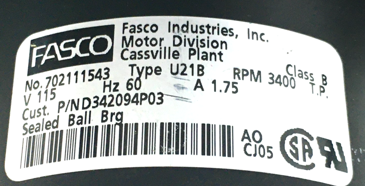 This is Fasco 702111543 Furnace Inducer Motor D342094P03 115V 3400 RPM used refurbished part, both bearings are new on this motor.