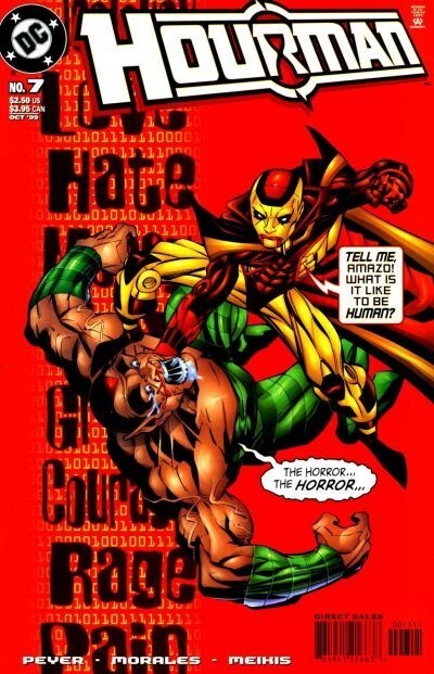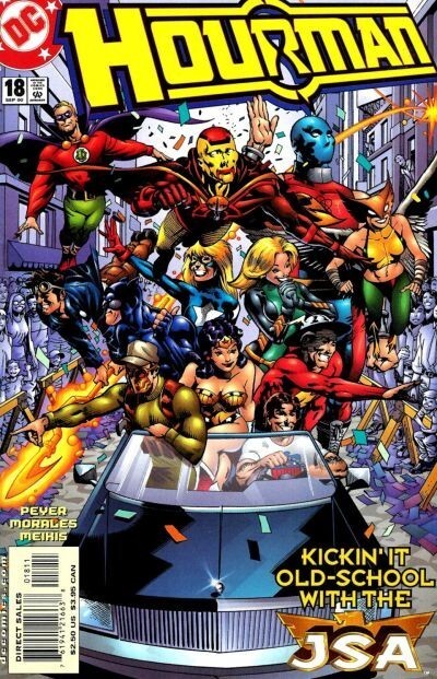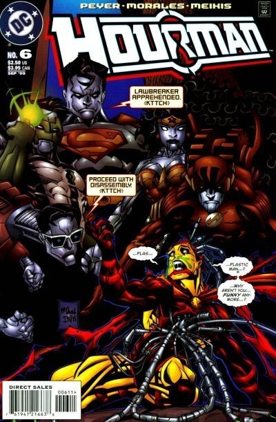 *Script by Tom Peyer, pencils by Rags Morales, inks by David Meikis; Hourman, frustrated by his ignorance, pairs up with Snapper Carr to learn how to be both human and a super-hero. Hourman brings Tomorrow Woman back to life to explain androids to him, and restores Bethany. A long essay on the creation of Hourman by Tony Bedard.