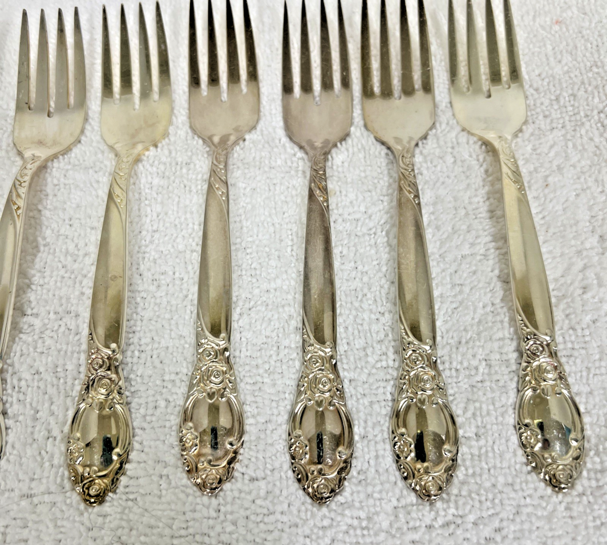 8 Plus One Vintage Oneida Ballard Country Lane Silver Plate Salad Forks 6 3/4". 9 total salad forks floral Ballard Country Lane pattern measure approx. 6 3/4" long, some light signs of use, good used condition, no monogram, might need cleaning. See pictures.