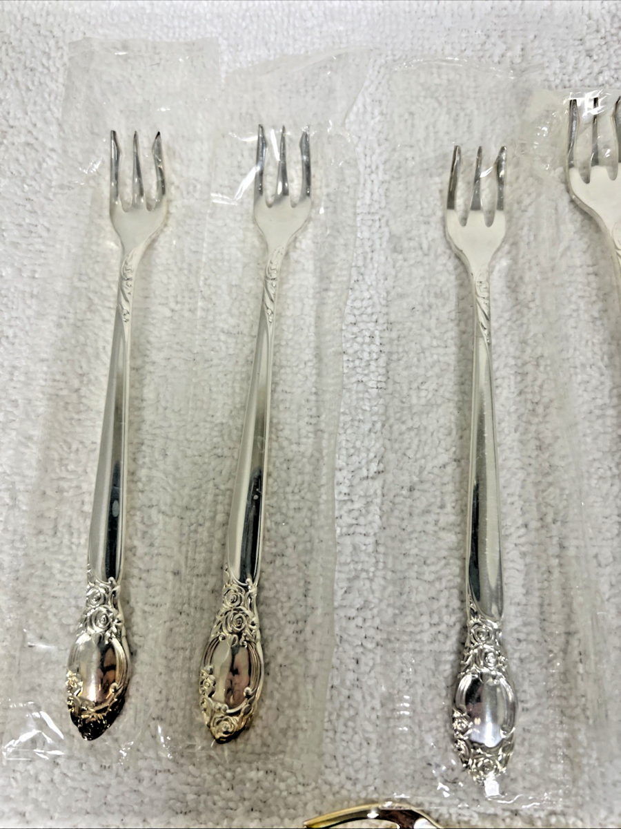 8 Vintage Oneida Ballard Country Lane Silver Plate Cocktail Seafood Forks. 8 cocktail seafood forks, 3 tine, floral Ballard Country Lane pattern measure approx. 6 1/4" long, great unused condition. 7 forks are in the original plastic bags unopened/sealed; one is out of bag but appears unused, no monogram. See pictures.