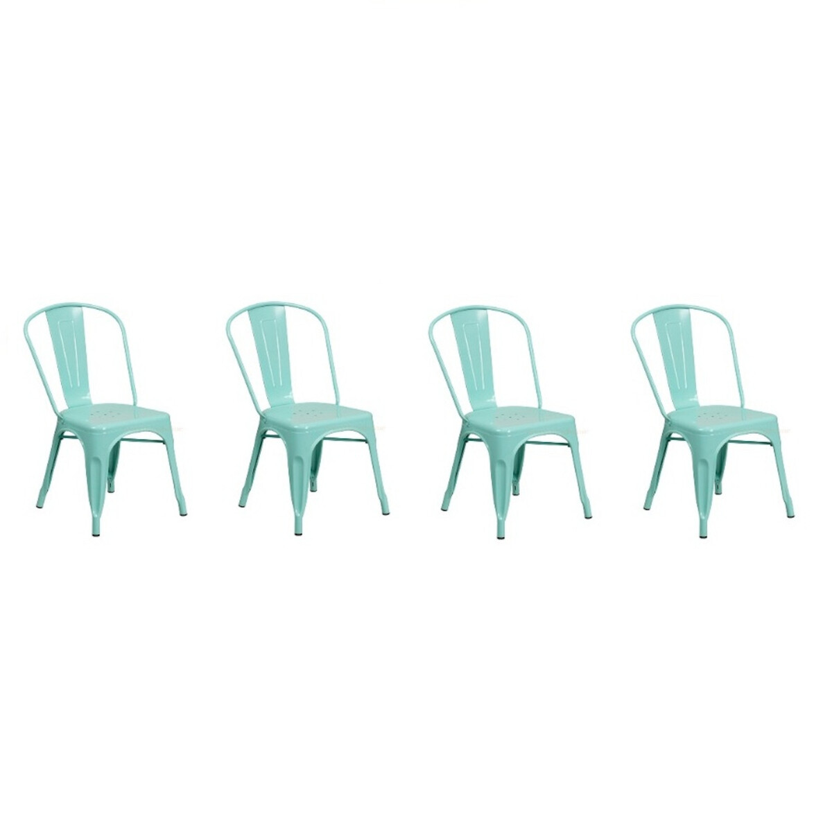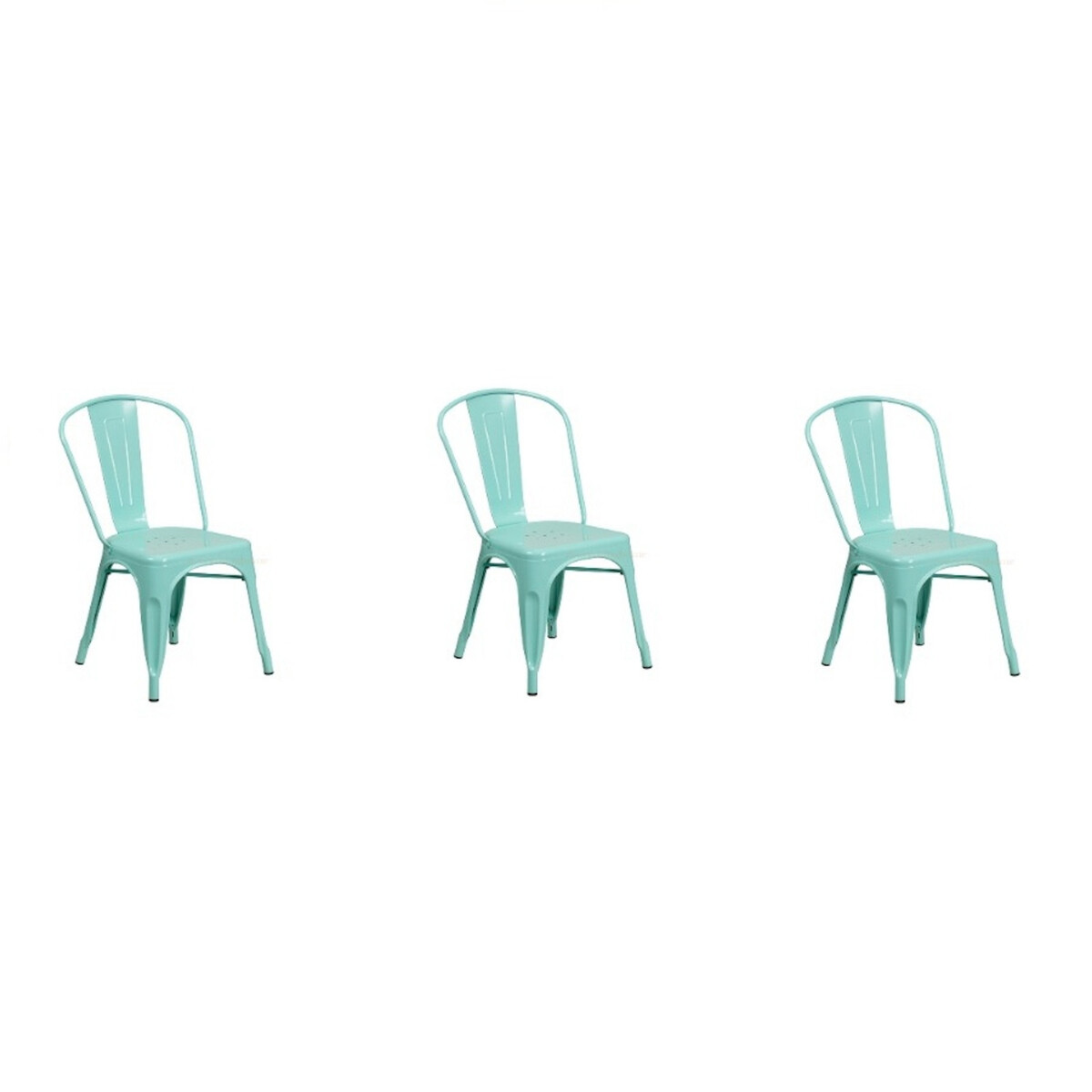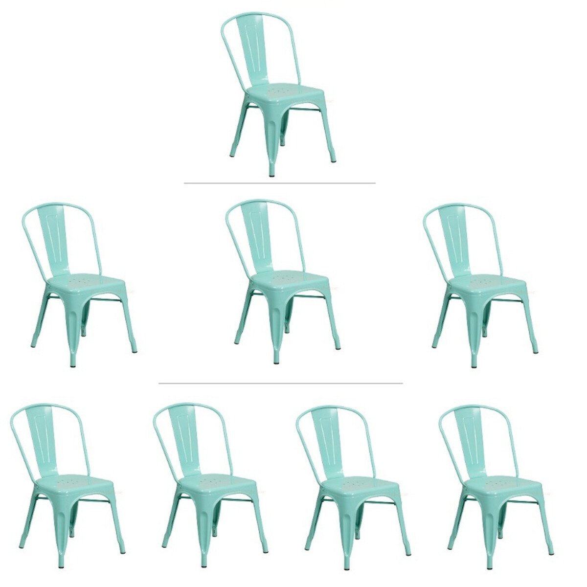 simple design lends itself well to just about any type of setting. Convenient stackable Bistro Style Chair stacks up to 8 chairs. Features Curved Back with Vertical Slat, drain holes on seat and mint green powder-coated durable galvanized steel.