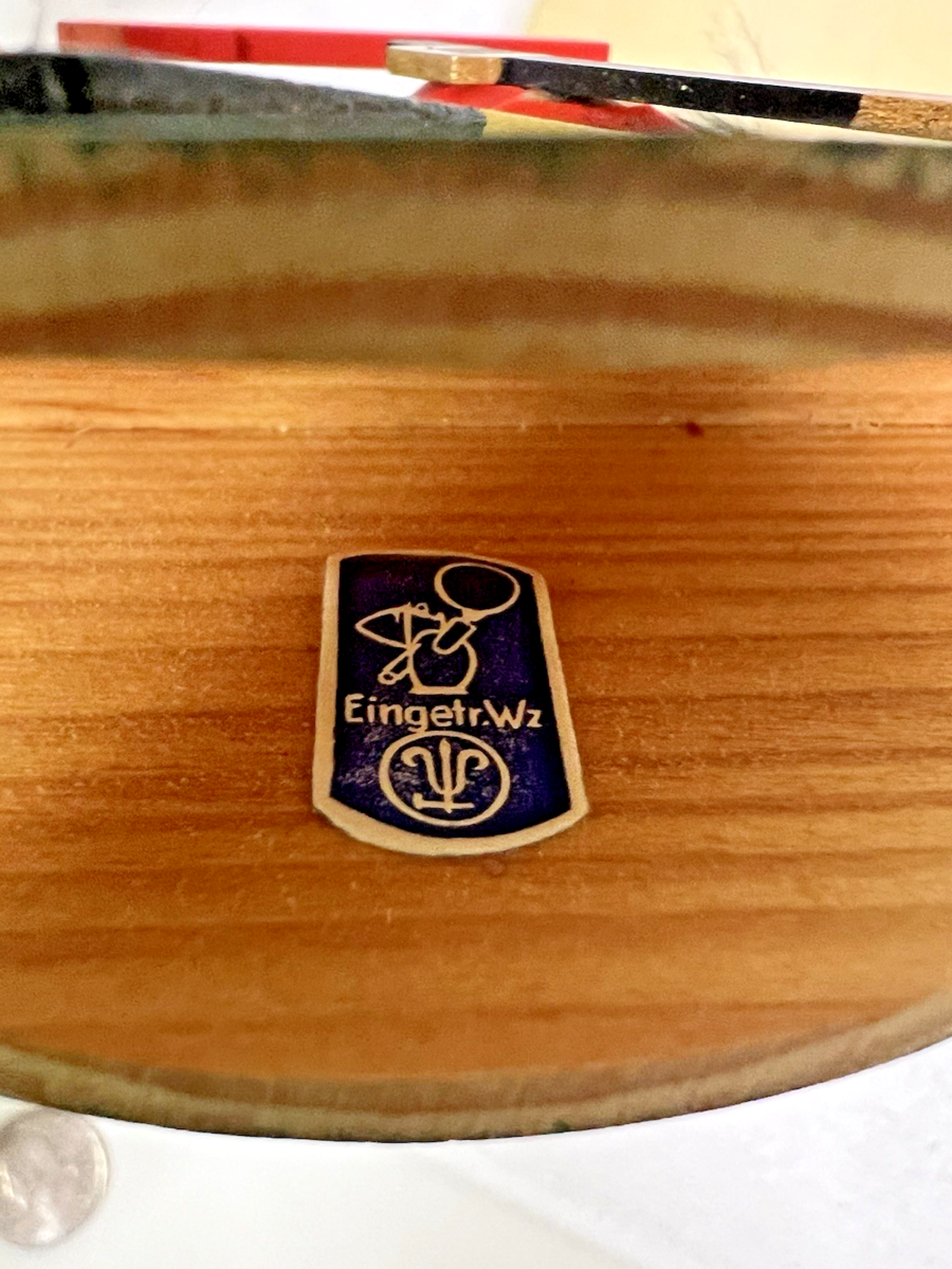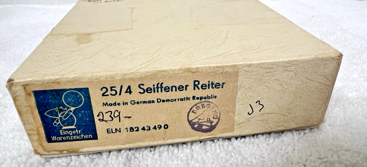 Vintage Seiffener Reiter Eingetr. Warenzeichen German Red Black Soldier Rocking Horse Original Box holiday ornament figure. Cute brown green rocking horse and red black painted yellow soldier, measures approx. 4 1/4" long and 4 7/8" tall, great condition, color paint in great condition, original box has writing, good condition. See pictures.