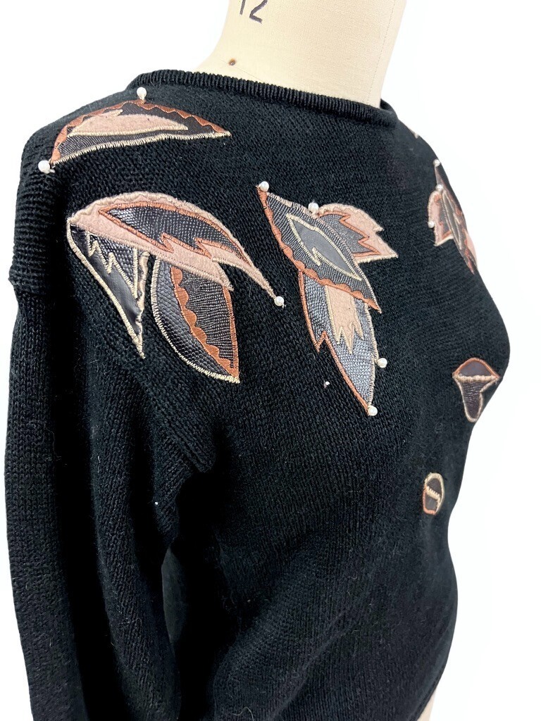 VTG 80s/90s Cotton Sweater Black Women M Leather Autumn Leaf Appliques Beaded