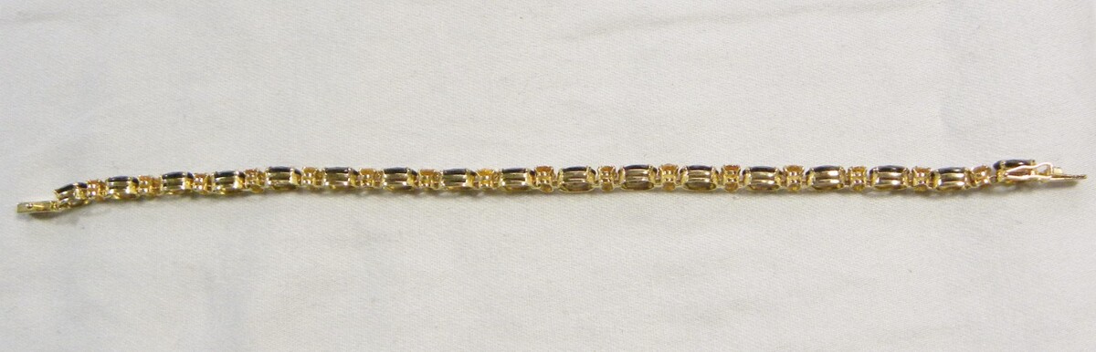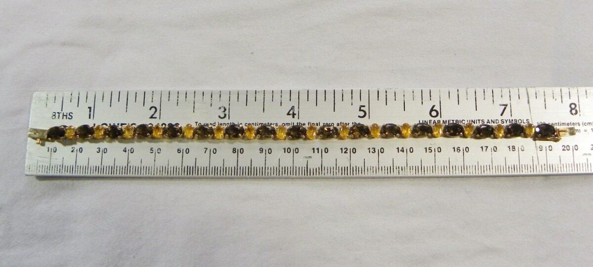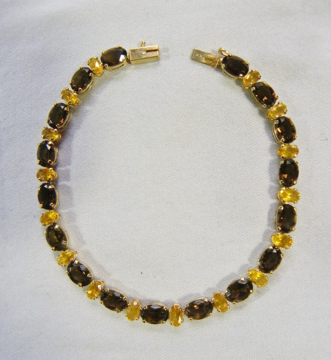 For Sale: Preowned Vintage Tennis Bracelet made of 14kt yellow gold with 17 --1 Carat each oval smokey quartz (smokey topaz) and 16--.25ct each Oval Citrine faceted Gemstones. It has an open box clasp with a safety loop on the side. It is 7.5" long with the bracelet CLASPED, otherwise its almost 7 7/8" long. Overall Bracelet Weight: a little over 10g. --Estimated 14 kt Gold only weight: 6 grams. I am not a jeweler but I have tried to honestly represent this piece fairly.
