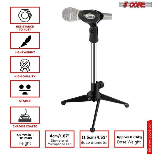 Enhance your recording setup with this sleek desktop microphone stand, featuring a stylish anti-corrosion chrome finish for a professional look. Its tripod base ensures stability, with adjustable height from 7.5 to 12 inches to suit your needs. The durable ABS and metal construction ensures long-lasting use. Perfect for podcasts, streaming, or video conferencing.