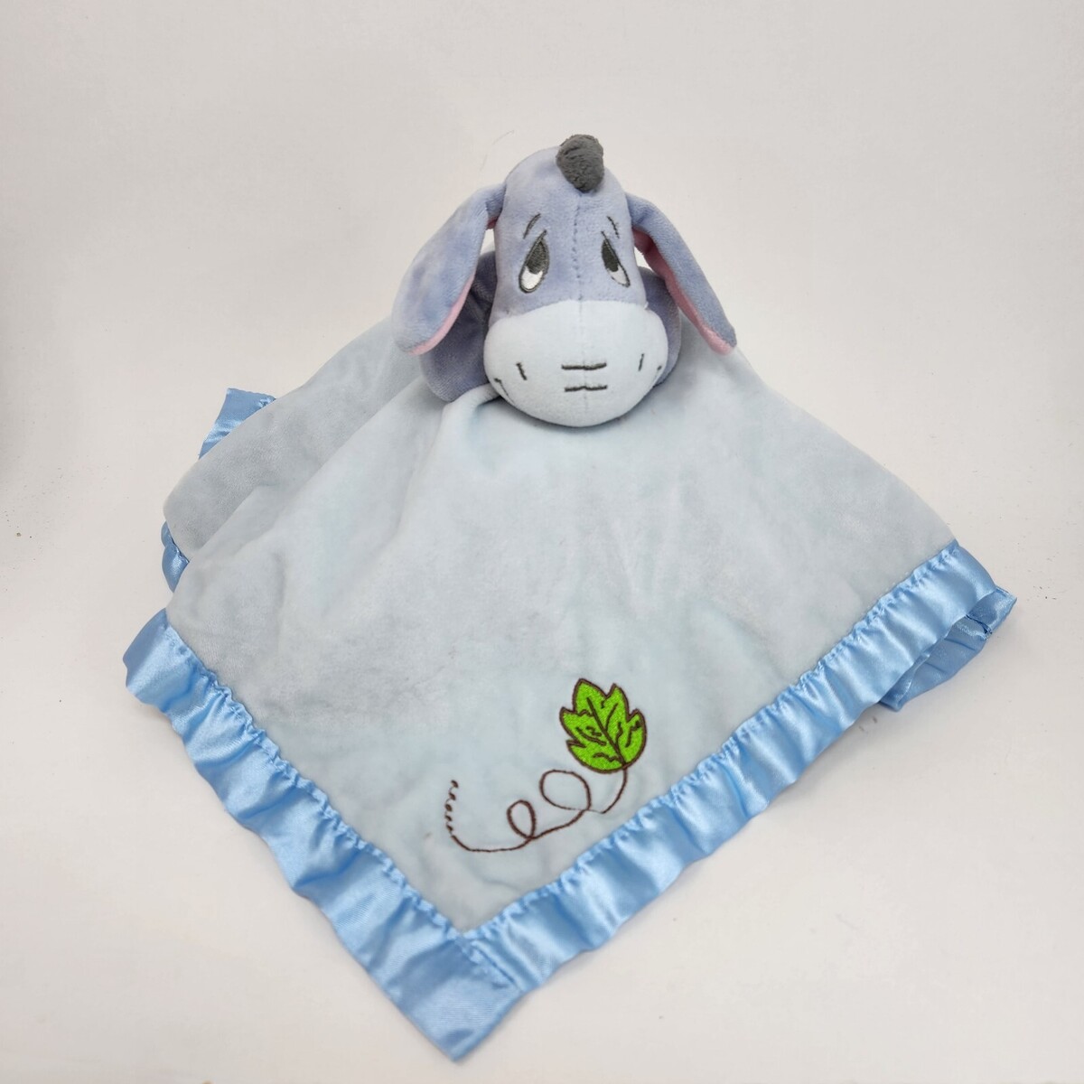 DISNEY WINNIE THE POOH BABY EEYORE SECURITY BLANKET BLUE SATIN TRIM GREEN LEAF