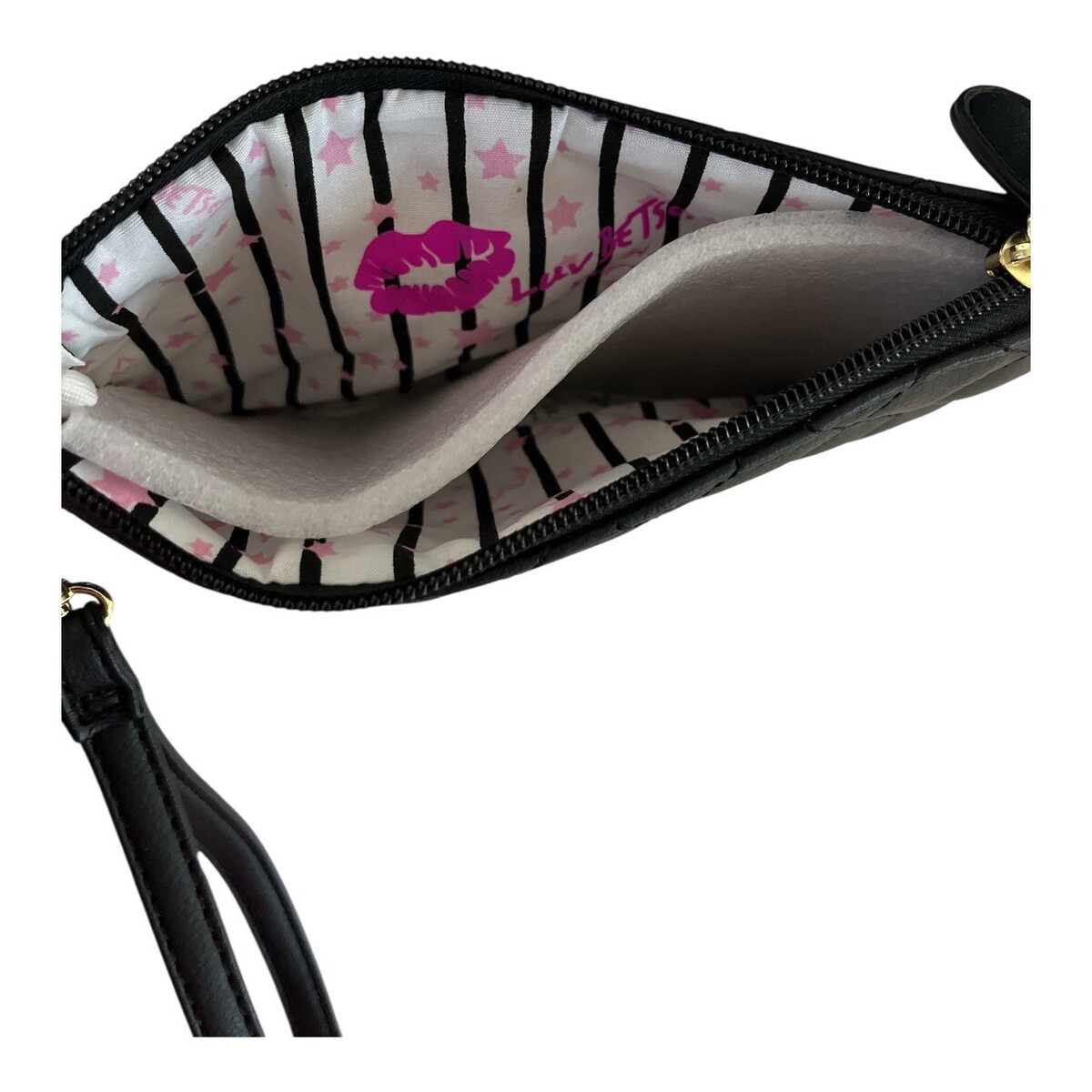 Betsey Johnson Luv Betsey 2-piece accessory set featuring a black quilted wristlet and matching unicorn face coin purse. The unicorn pouch includes embroidered lashes, pink cheeks, metallic horn detail, and attached wrist strap. Interior lining features signature Betsey Johnson pink lips and star print.