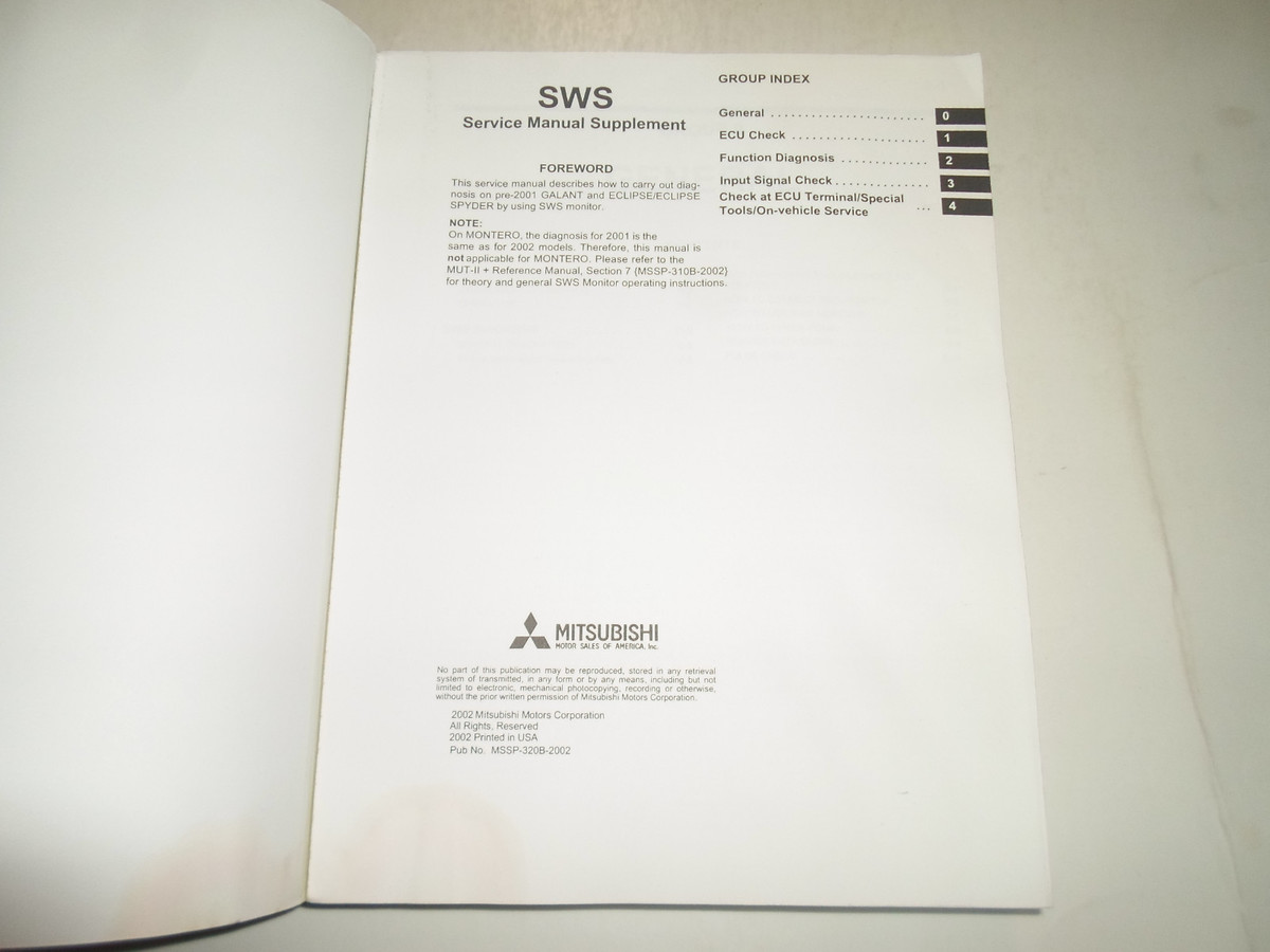 1999 2000 MITSUBISHI GALANT/ ECLIPSE/ ECLIPSE SPYDER MANUALE DI SERVIZIO SUPPLEMENTO MANUALE DI NEGOZIO DANNEGGIATO DALL'ACQUA