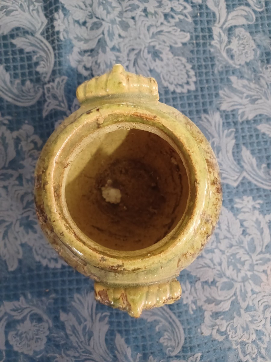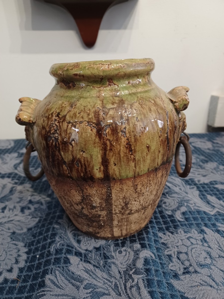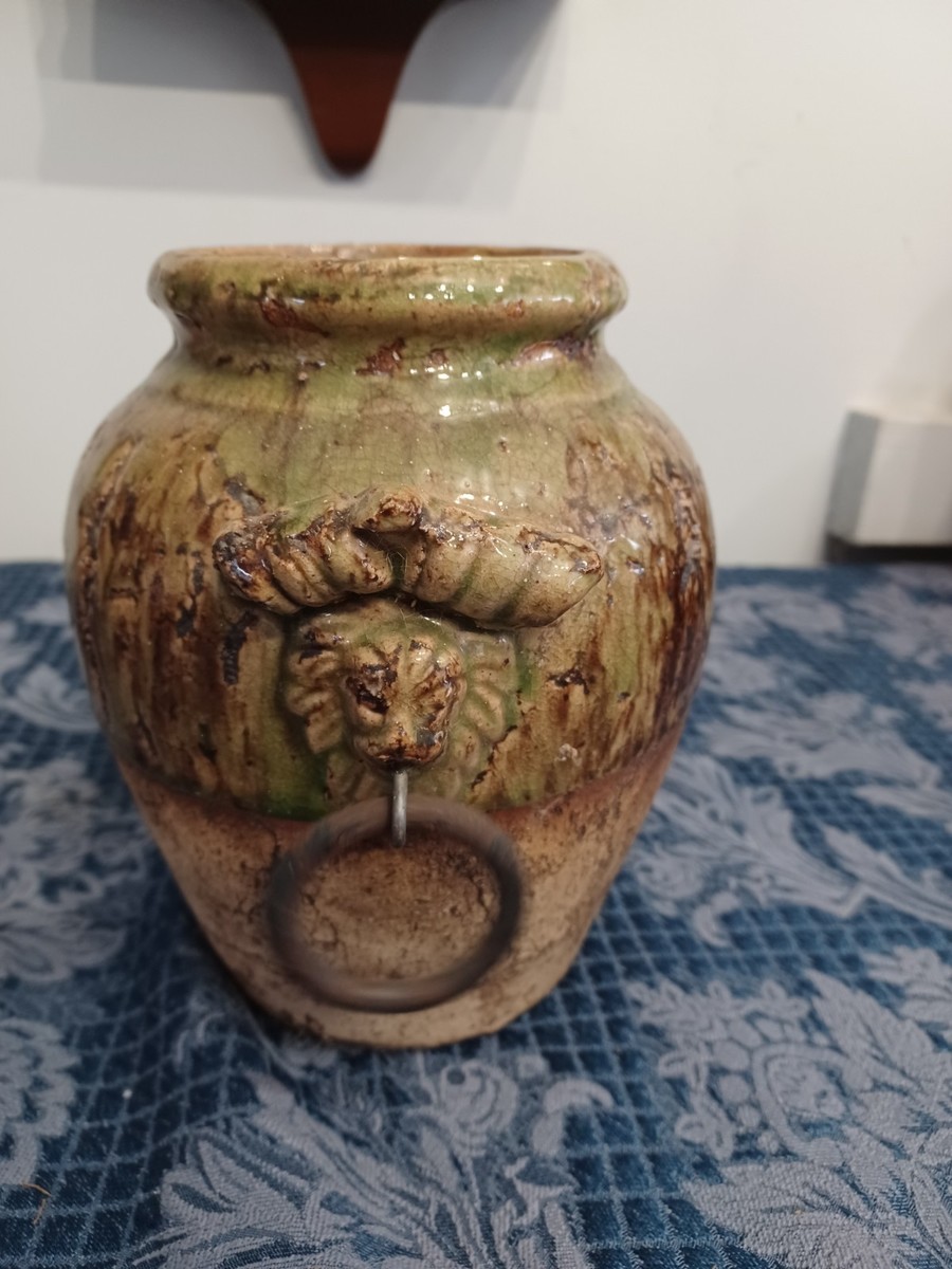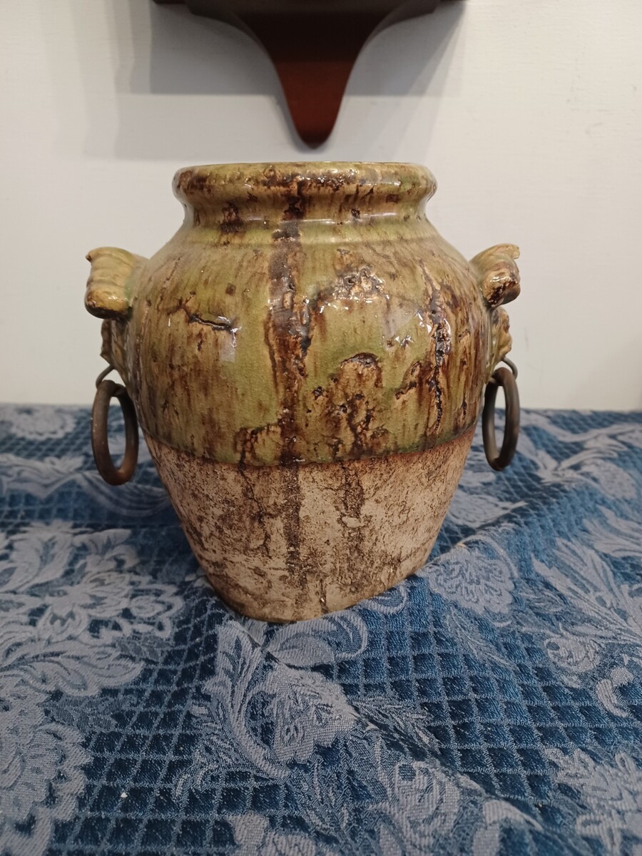 Vintage Green & Tan Lion Head & Metal Rings Heavyweight Pottery Glazed Vase 7.5"