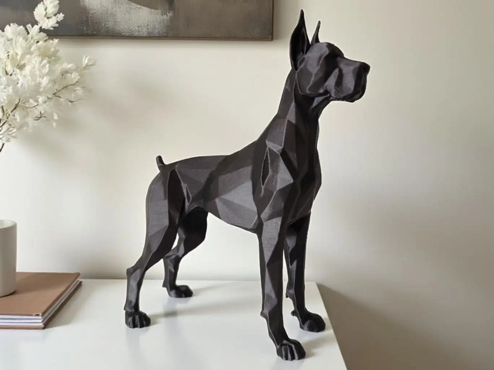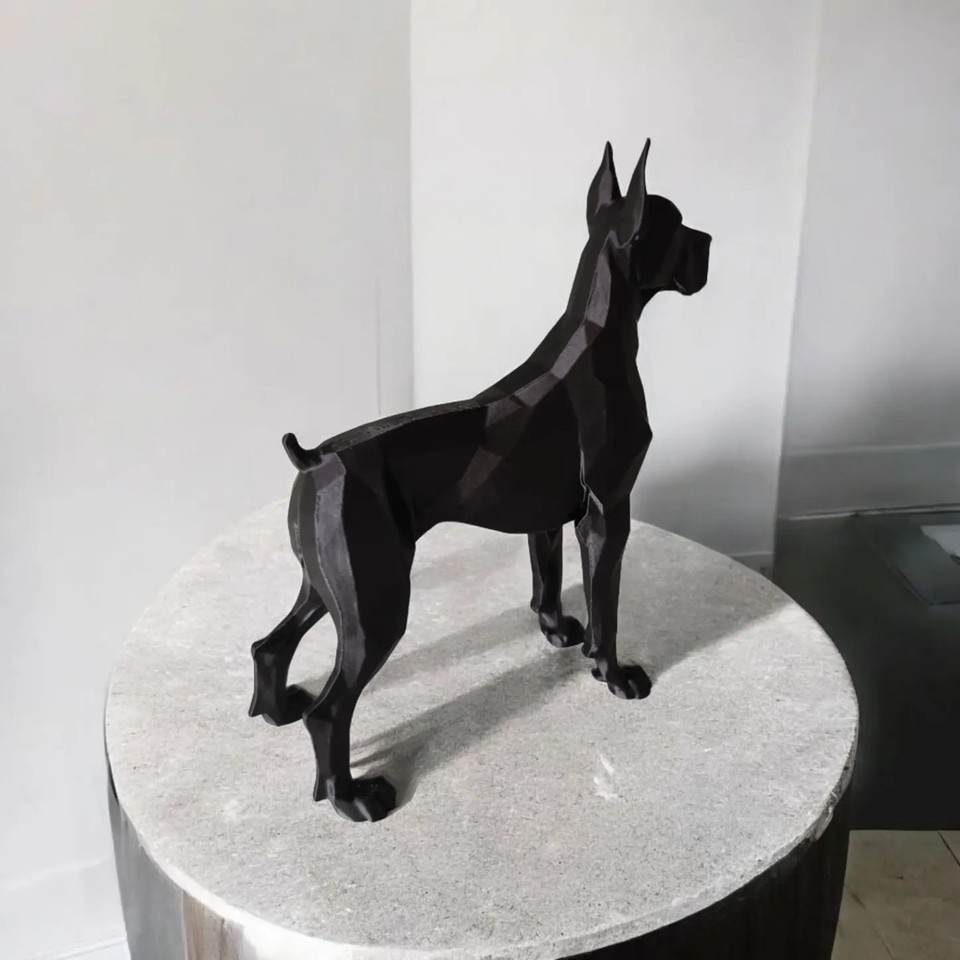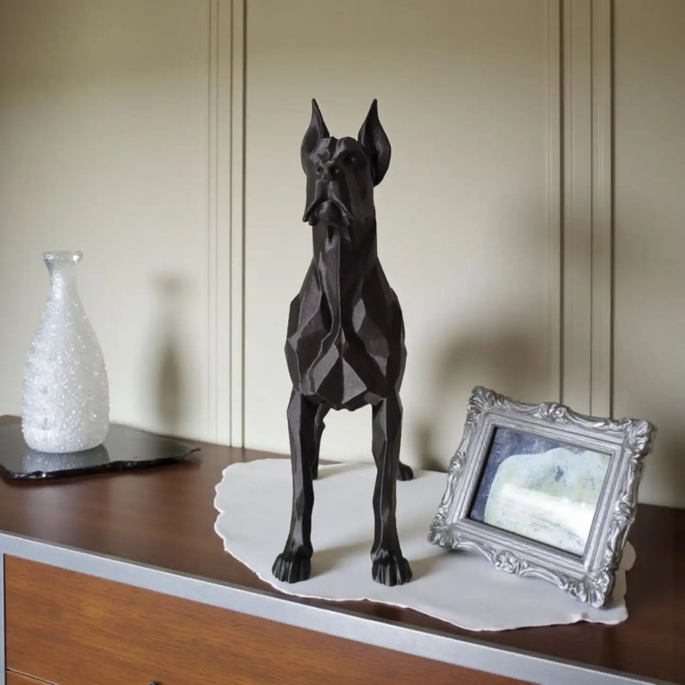 Add a touch of modern elegance to your space with this striking geometric Great Dane statue. Featuring a sleek, low-poly design, this figurine captures the noble stance of the breed in a contemporary artistic style. The matte black finish provides a sophisticated look that complements any home or office decor, from minimalist to modern. This sculpture is a perfect statement piece for a bookshelf, desk, or mantel and makes an excellent gift for any Great Dane enthusiast.