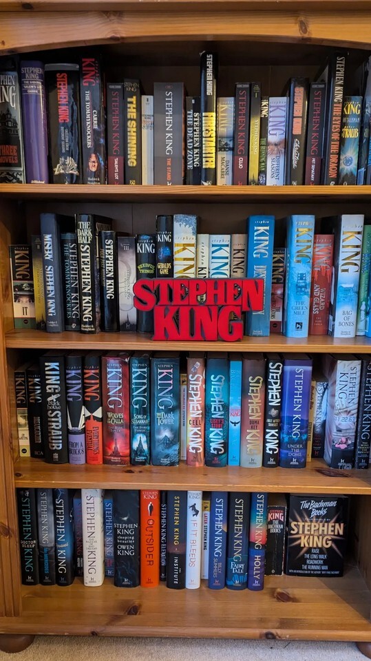 This distinctive 3D Stephen King logo sign is a must-have for any dedicated fan or collector, perfect for personalizing a bookshelf or display. Crafted from a rigid material, likely plastic or wood, the sign features the author's name in bold, dimensional red lettering. It measures approximately 7 inches wide and 2.5 inches tall, presenting in very good, clean condition suitable for immediate display among your favorite literary works. This unique piece adds a touch of fan appreciation and character to any horror literature collection, making it an ideal gift or personal keepsake.