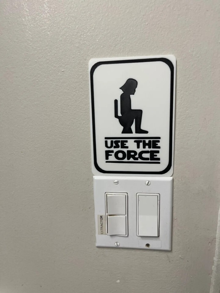 Add a touch of galactic humor to your home with this funny Star Wars-themed sign. This novelty wall plaque features a silhouette of Darth Vader on a toilet with the iconic phrase "Use The Force" in the classic movie font. The sign has a clean black and white design with rounded corners, making it a perfect addition to any bathroom or restroom decor. It serves as a great conversation starter and is the perfect gift for any Star Wars fan.