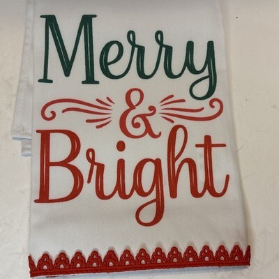 The NEW Decorative Dish Tea Towel for Christmas, ?Merry Bright? is a rectangular tea towel made from a cotton blend material. It features a white color with a seasonal theme perfect for the holiday season. This kitchen towel is machine washable and stain resistant, making it practical and easy to use in your kitchen. It is a festive addition to your kitchen collection, and it ships in 24 hours.