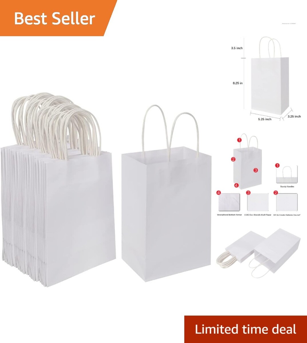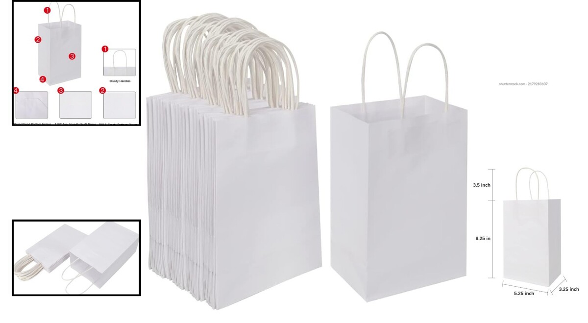 5.25x3.25x8.25 Inch White Kraft Bags - 100 Bulk Gift Bags for Any Occasion