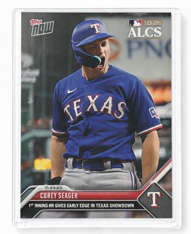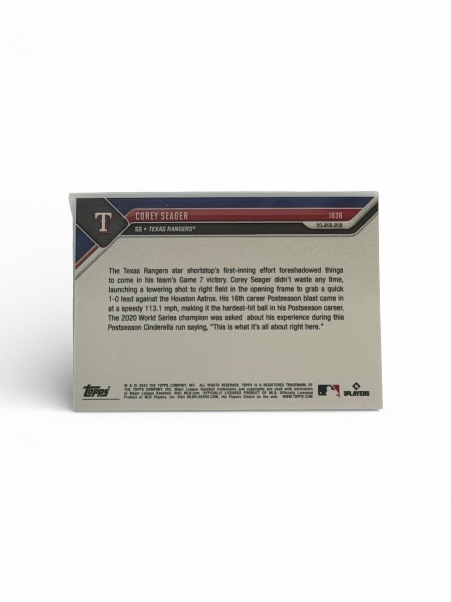 2023 Topps NOW Corey Seager Card 1036 from the ALCS dated 10.23.23. Celebrates his 1st inning home run that gave Texas the early edge. Extremely limited print run of only 888 produced, making this a true low-circulation postseason piece.