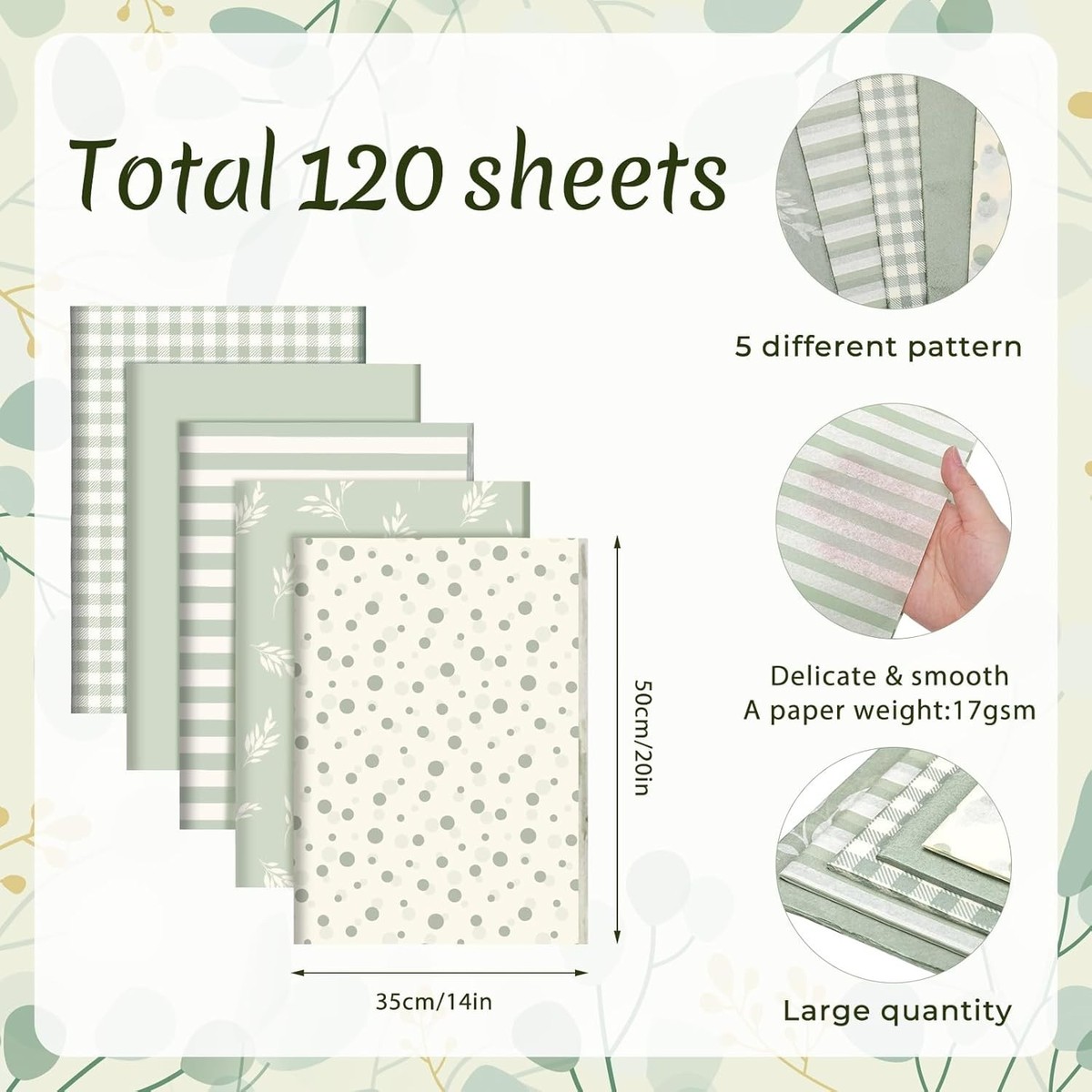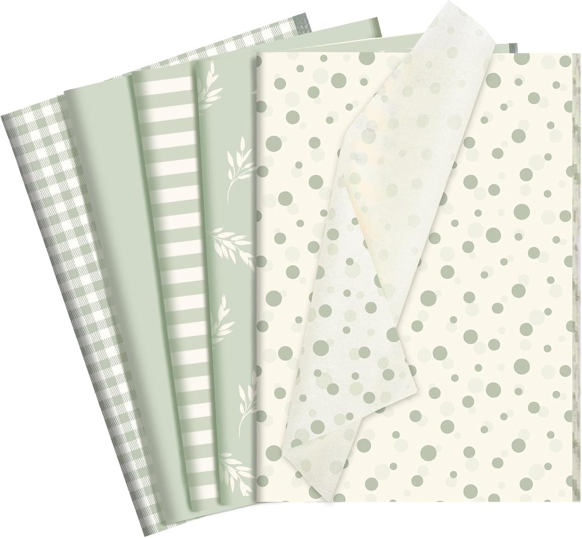 120 Sheets Sage Green Gift Tissue Paper, 5 Unique Designs, 14 x 20 Inch