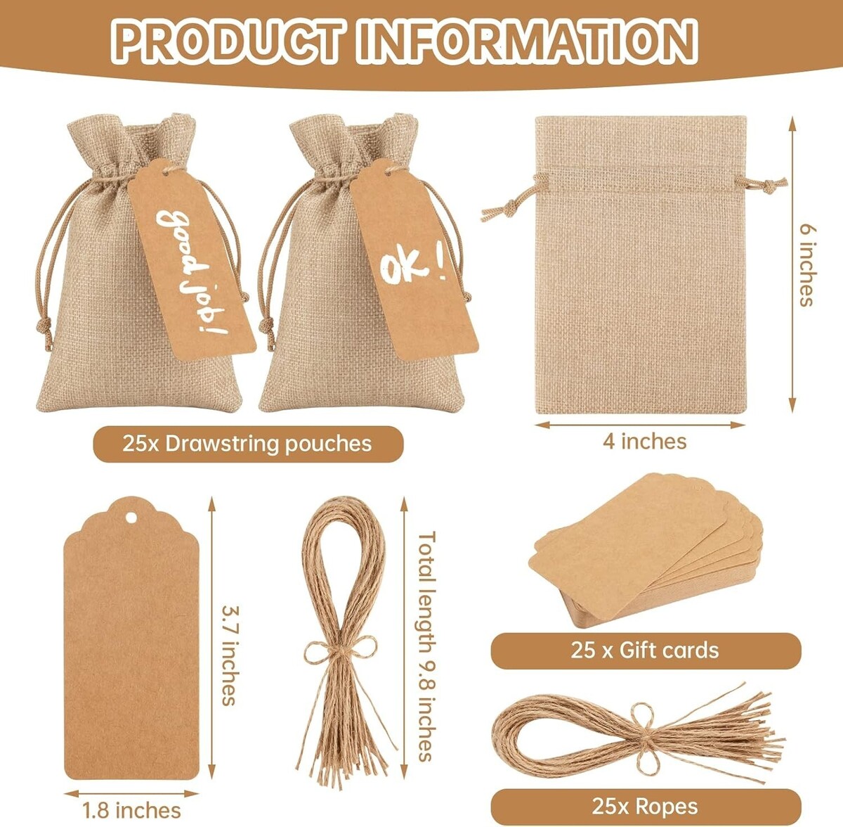 Transform your gifting experience with our 25PCS 4x6" Burlap Gift Bags. Designed with quality and convenience in mind, these bags offer a chic solution for any occasion. Whether you're hosting a party, celebrating a milestone, or simply spreading kindness, their sturdy and stylish design guarantees presentations that leave a lasting impression.