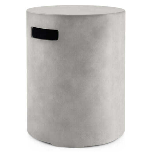 ? Fits standard 20 lbs propane gas tanks ? Can be used as a tank hideaway or a side table ? Equipped with non-slip foot pads to ensure stability ? Constructed in a sturdy structure with a high load-bearing capacity ? Designed with a groove hole for gas hose ? Easy to move with 2 side handles ? Durable for long-time outdoor use with natural ore powdered surface ? Requires no assembly quick to set up ? Matches with fire tables or fire pits for patio garden and more