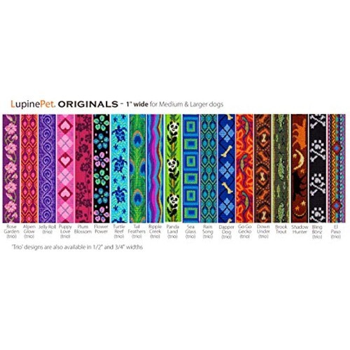 All Lupine products are proudly built in Conway, New Hampshire and Guaranteed (Even if Chewed). 1? collars are suitable for medium and larger dogs. Made from jacquard woven nylon, with the pattern woven into the webbing (never printed or sewn on!) Features strong bar-tack stitching, welded D-ring and a custom designed side-release buckle. In a range of fashion-inspired patterns with matching leads available. Two adjustable size ranges. To determine collar size, measure snugly around the middle of the dog?s neck, then add an extra 5-percent for a comfortable fit. Machine wash, warm water, mild soap (no bleach or bleach alternative). Air dry. Lupine products are not recommended for tie-out.