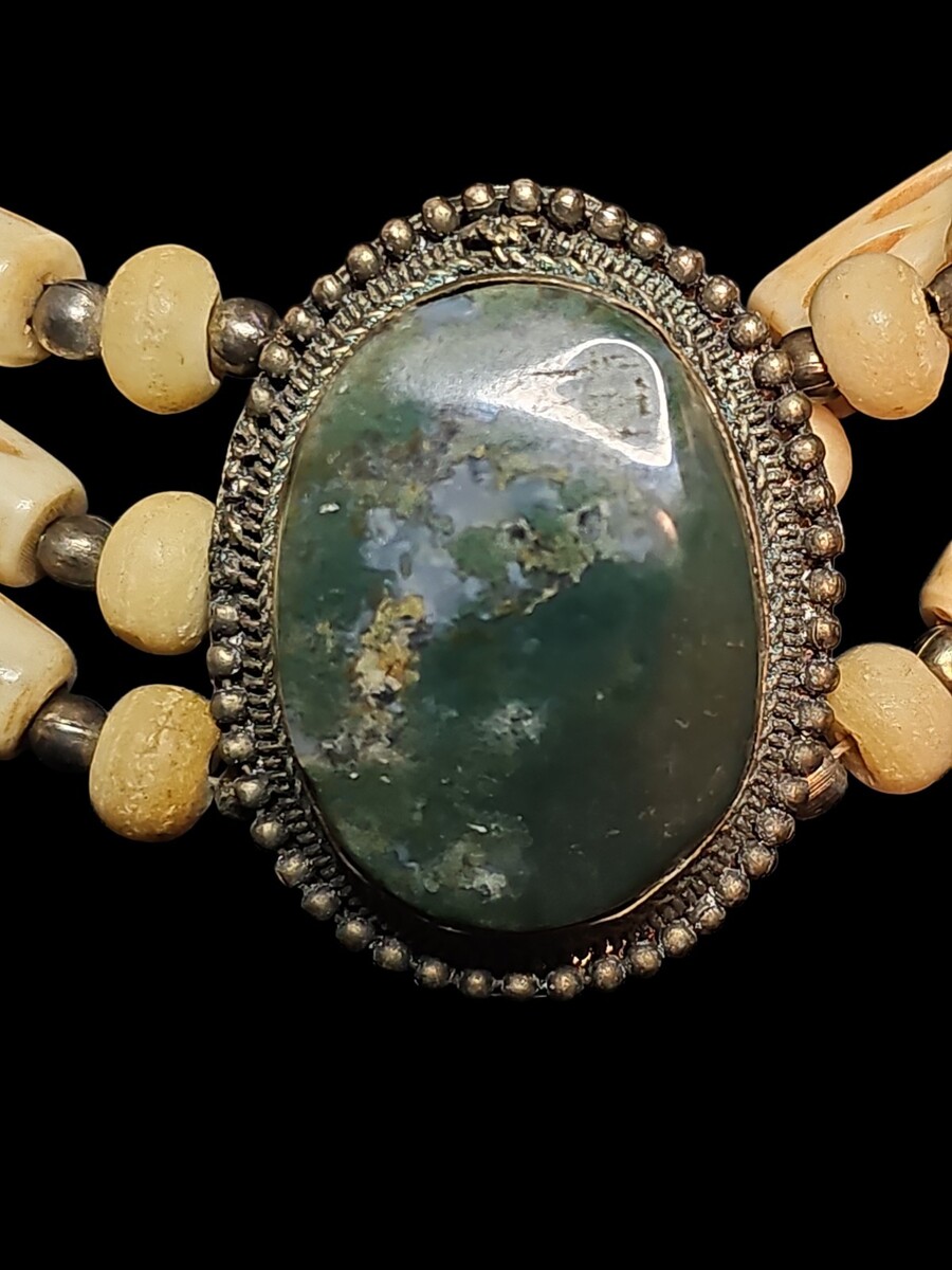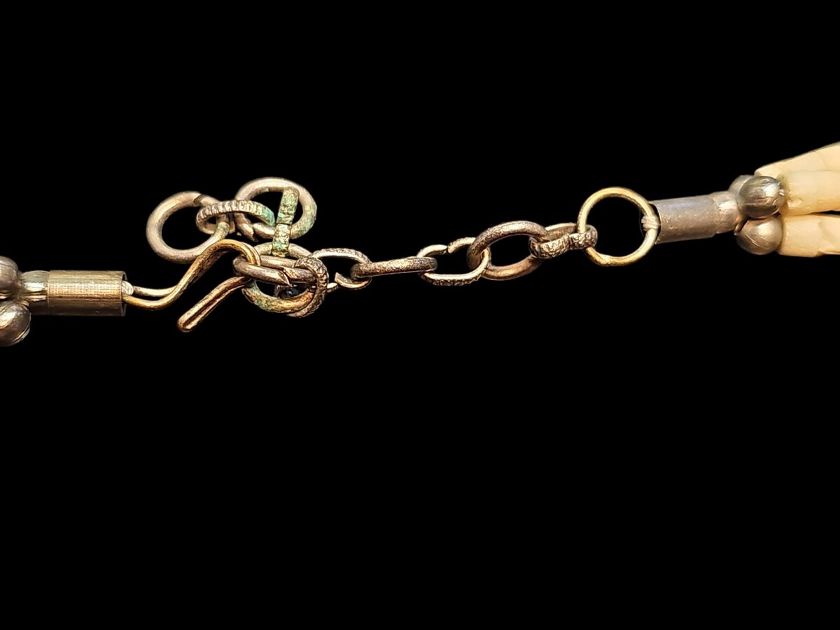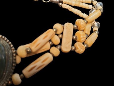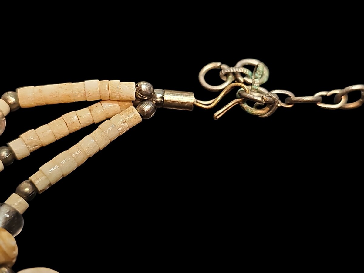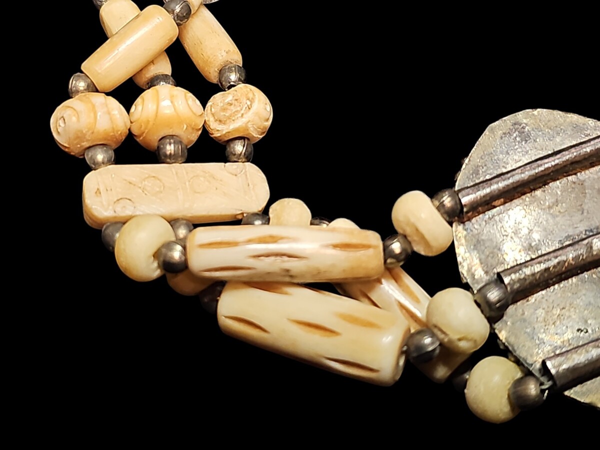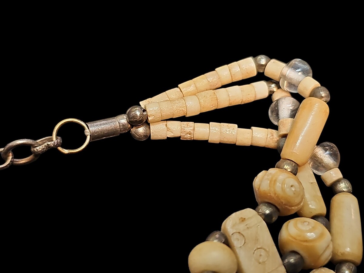 The necklace is constructed with multiple strands of carved natural material beads in warm ivory tones, accented with sterling silver spacer beads throughout. The design has a strong artisan and Southwestern aesthetic and sits beautifully at the neckline.