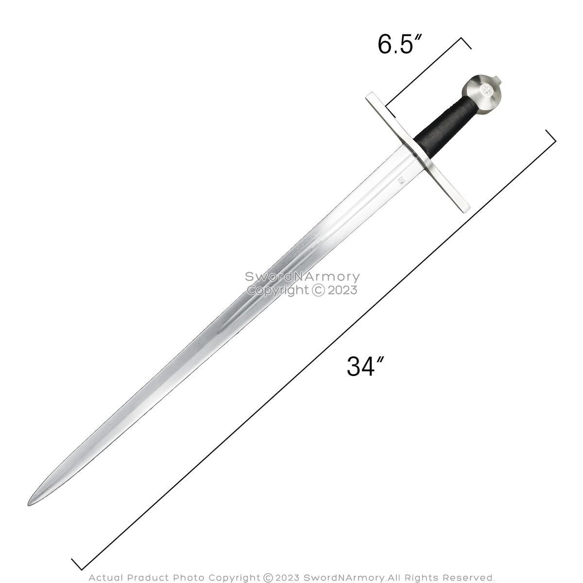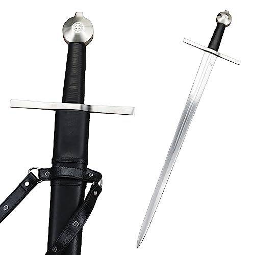 Product description: Our collection of short arming swords is the epitome of beauty in simplicity, and a must-have for medievalists and martial artists of all ages, strengths, and walks of life. This particular model features a pleather sheath and belt, and a type J1 Pommel. Bring an elegant touch to your kingly armory by bringing home all five swords today! [Dimensions] Overall Length: 36.5? Blade Length: 27.5? Hilt Length: 4.5? Balance Point: 1.75? Weight: 2.56 lb [Blade] This full tang and functionally blade is constructed of high-carbon steel and is deeply fullered [Hilt] Wrapped simply by black pleather and bookended by a type W pommel and an equally simple type 1 crossguard [Scabbard] The elegant black pleather sheath is accompanied by a matching belt [Quality] All of our products are made of the finest materials, and are packaged securely in our own warehouse