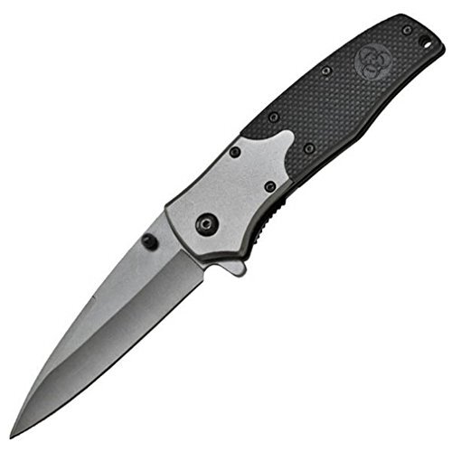 This Tactical Knife design provides a top notch G10 grip with a biohazard symbol .