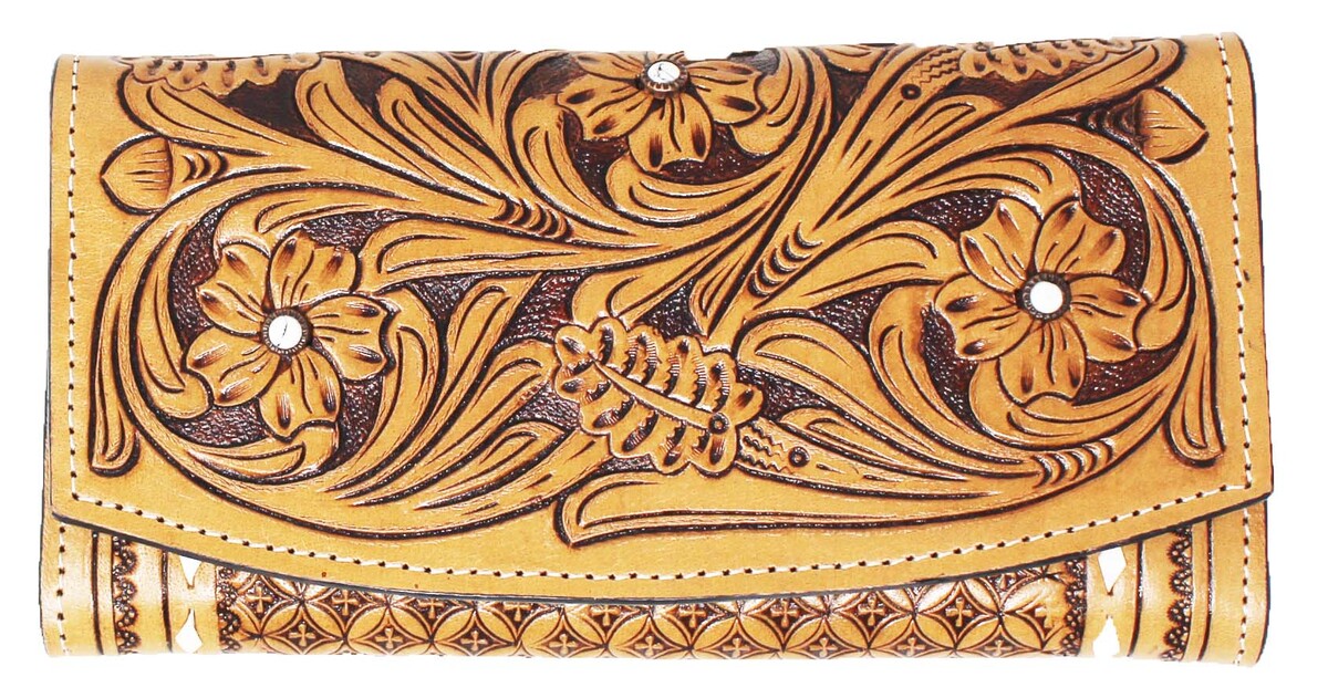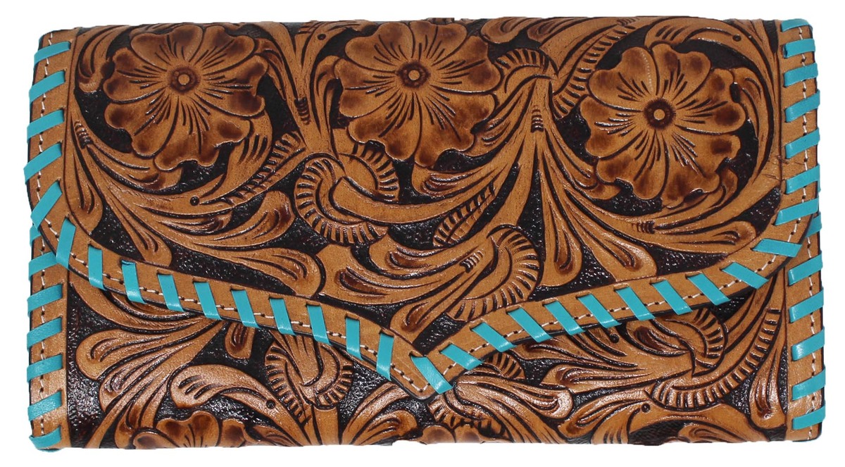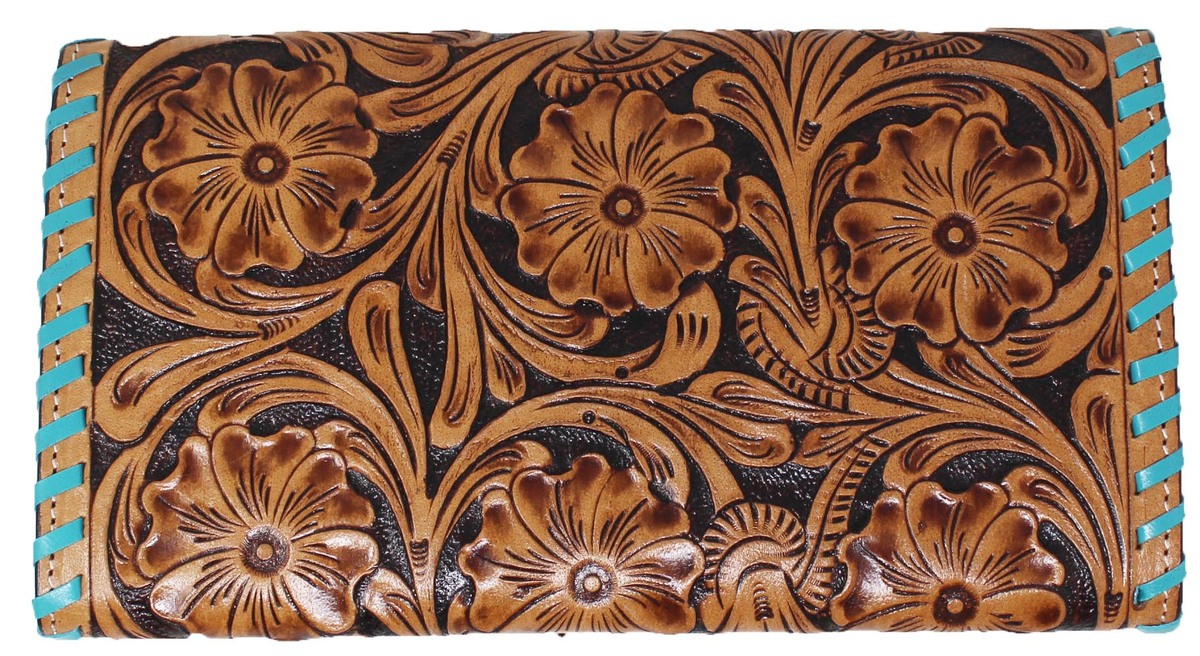 Challenger women's western wallet made from supple genuine full-grain leather to endure everyday use. Clutch features floral hand-tooled leather, and turquoise laced edges. The button closure main compartment comes fully lined with easy to clean fabric. Inside comes with five open pockets, a zippered coin compartment, and ten credit card slots. Wallet measures 9" L x 5" W.