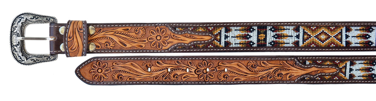 Challenger 1-1/2" wide belt handcrafted from genuine heavy-duty full grain cow leather. Belt features a hand-tooled antique floral design, with a multicolor beaded inlay. Belt comes accented with a changeable silver engraved buckle. The snap button closure end makes changing of buckle quick and easy. We recommend to go up 2" from your waist size for a comfortable fit.