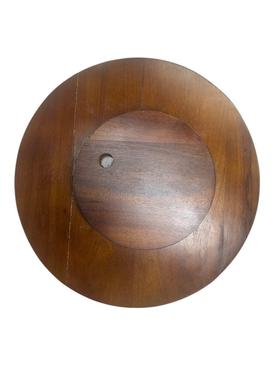 The 5-Compartment Carved Wooden Pu Pu tray has a little fading on the wood and a noticeable crack on the base of the tray. This crack does not appear to penetrate through and could be easily repaired if desired.