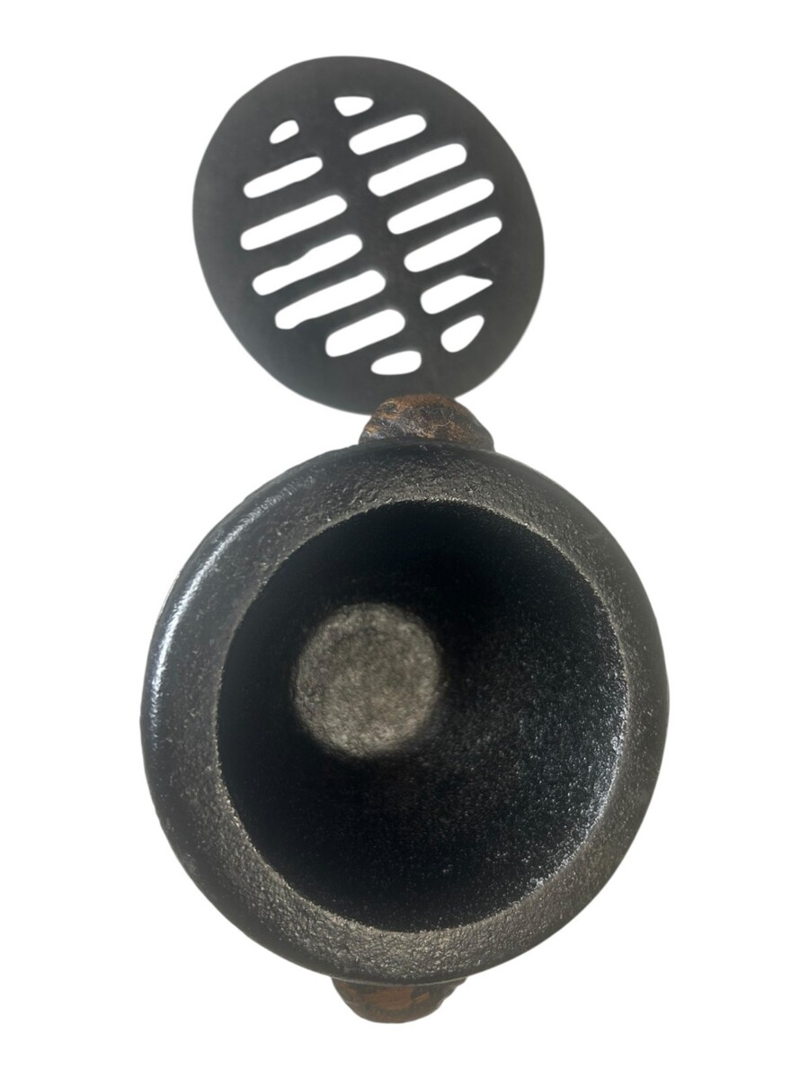 A versatile dining centerpiece that combines traditional craftsmanship with functional design. This intricately detailed cast iron grill sits atop a wooden, rotating serving platter, offering a unique way to present and cook small appetizers or share a communal dining experience.