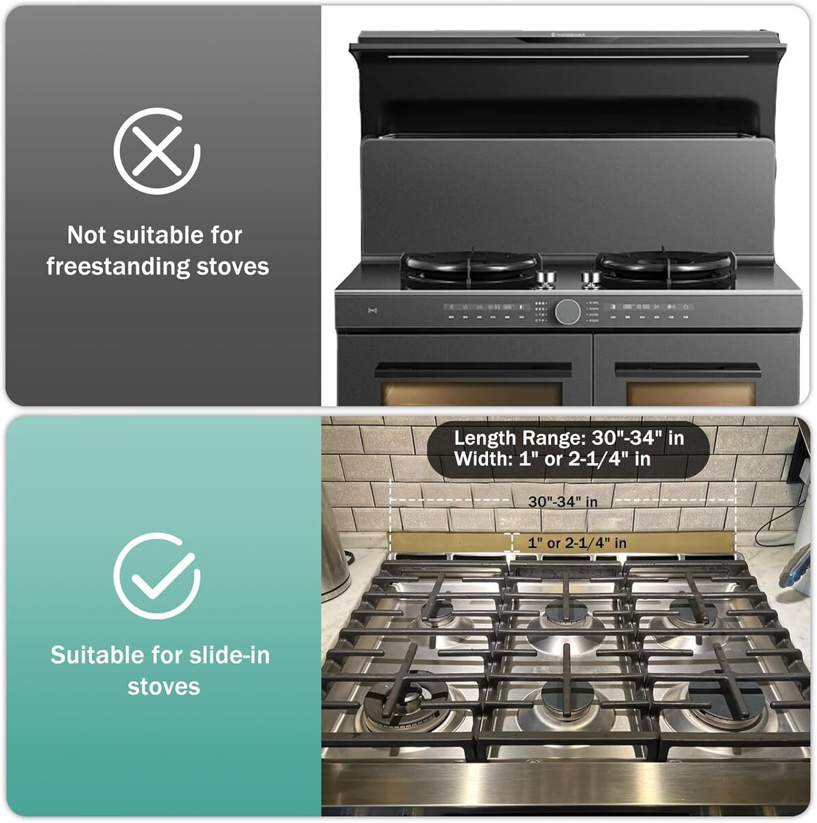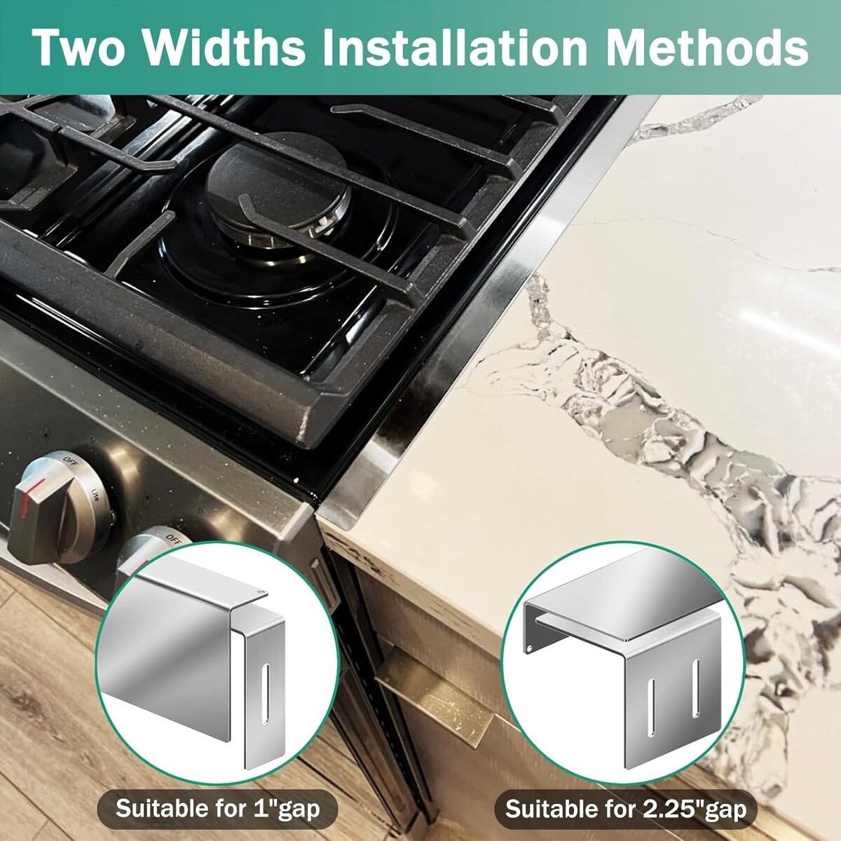2 Different Widths: These stainless steel stove gap covers are suitable for gaps measuring 30"- 34" Long and 1" or 2.25" wide between the stove and wall/cabinet. The design of two different widths allows you to be more flexible when filling gaps. You can choose the appropriate 2-1/4" or 1" stove gap bracket according to your needs, making it more convenient for you to install