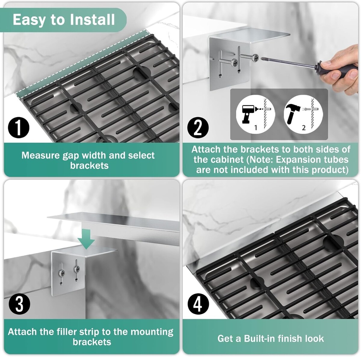 Package Included: The kitchen gap covers strips kit includes 1* 30" stainless steel fill strip, 4* Mounting brackets (When installing, choose the appropriate size as required), and 9* Screws