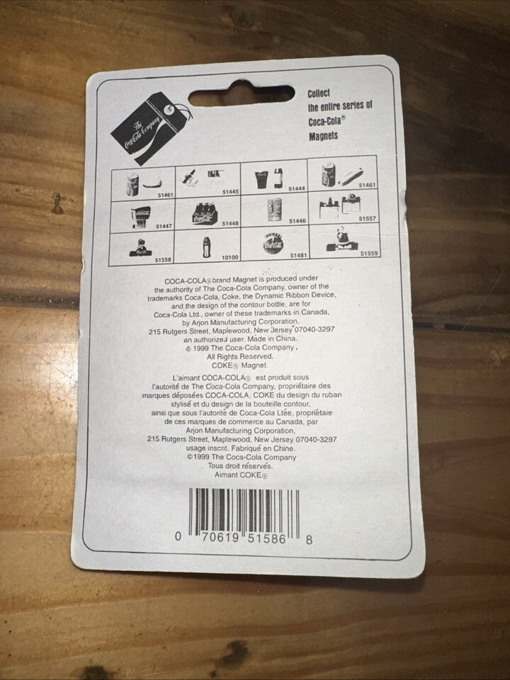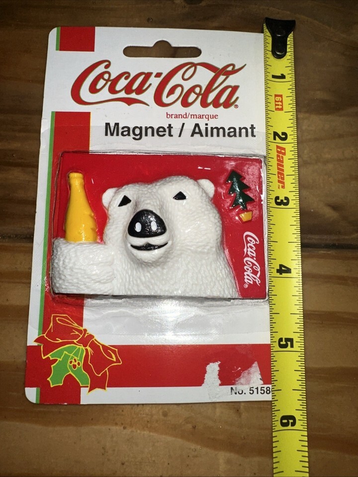 The product is a Coca-Cola magnet featuring a Coca-Cola bear holding a Coca-Cola bottle. The magnet is multi-color and showcases the iconic Coca-Cola brand. This collectible item would be a great addition to any Coca-Cola enthusiast's advertising or soda-themed collection. Its original design adds to its appeal for collectors looking for unique and nostalgic pieces to display.