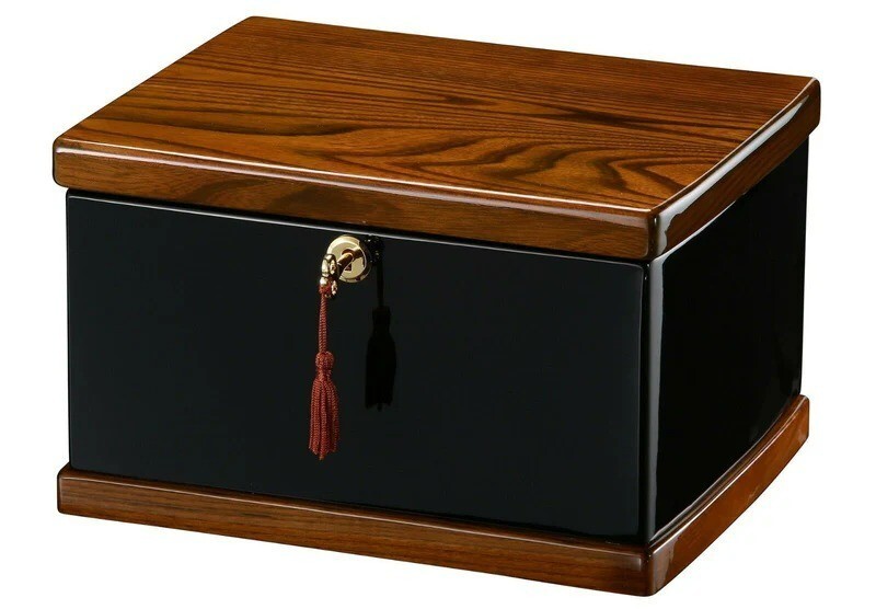 The Courage Urn is crafted from hardwood and offers a dignified, maintenance-free solution for preserving your loved one?s ashes. This memorial chest features a striking two-tone piano finish with gently curved sides, combining a piano walnut?finished top and base with black piano?finished sides on select solids and veneers.